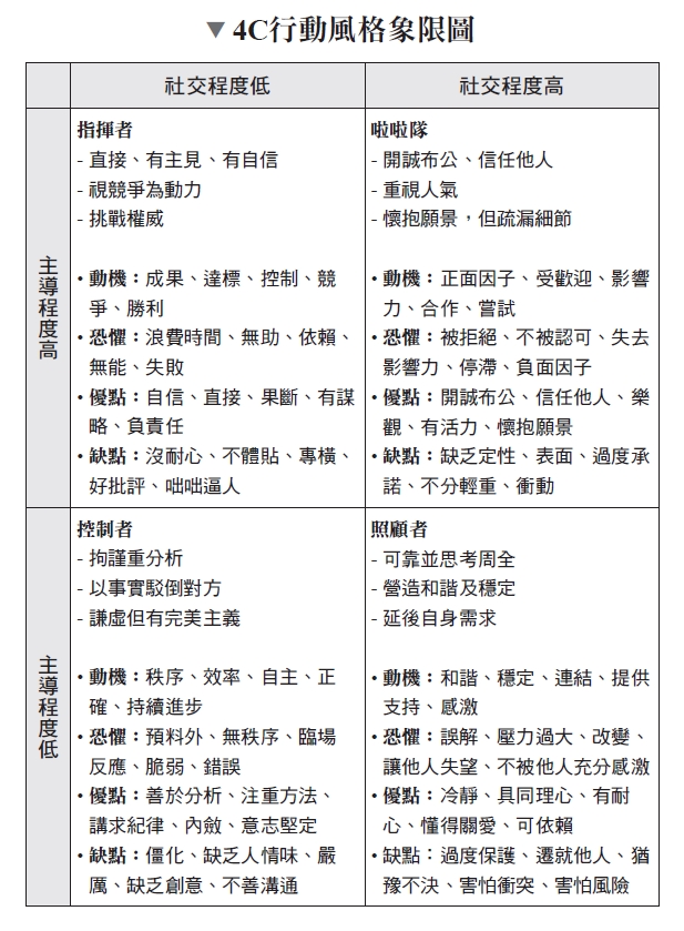 《向上管理》將社交程度、主導程度作為軸線,歸類出四種象限類型(4C)的主管風格,並整理出不同類型主管的特色與溝通之道: